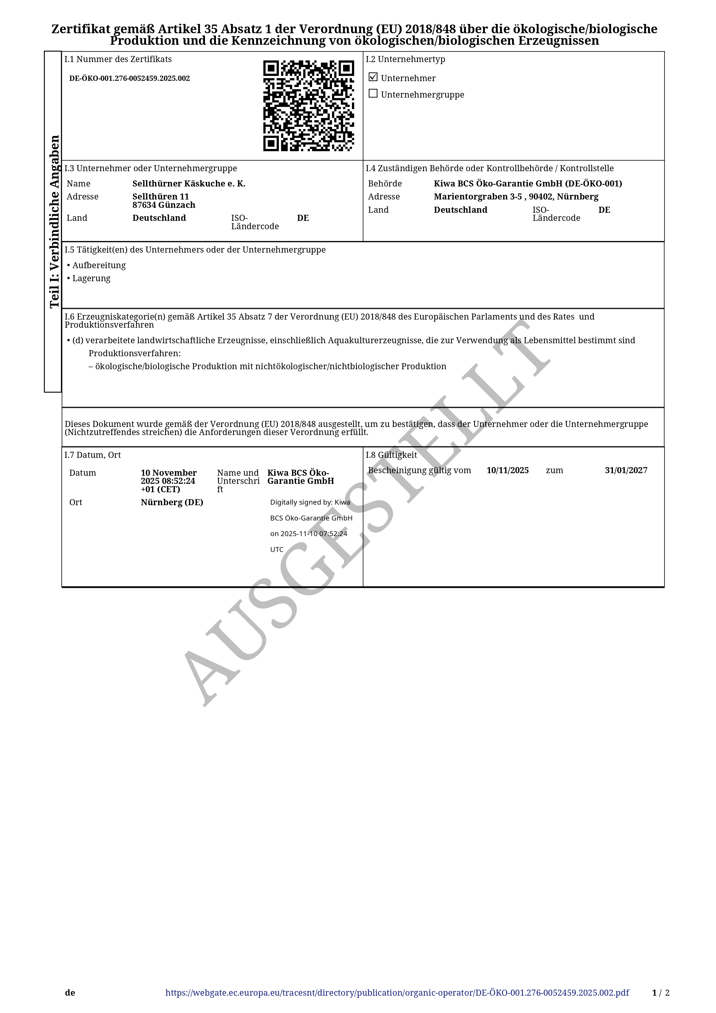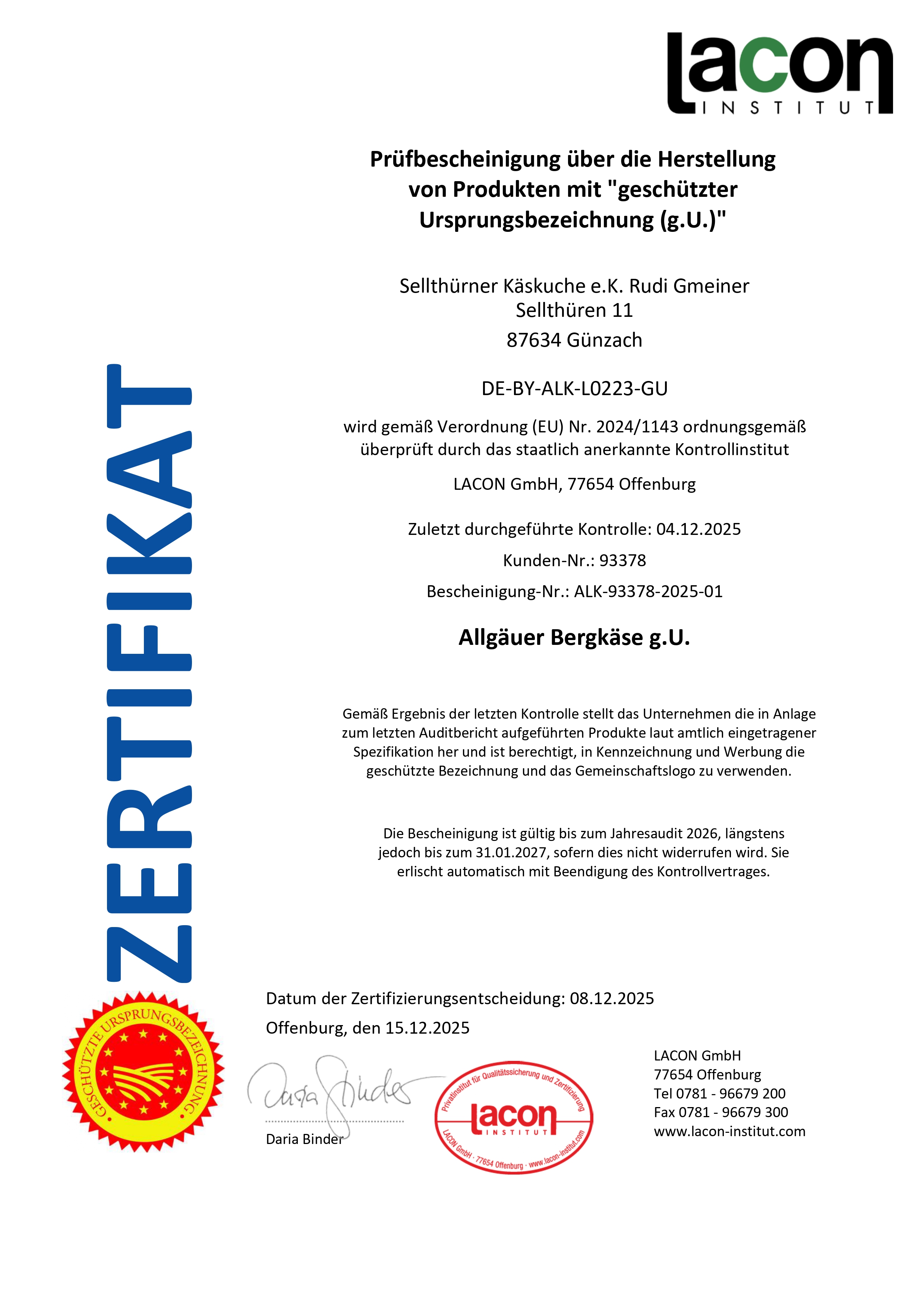 Allgäuer Bergkäse g.U. Zertifikat