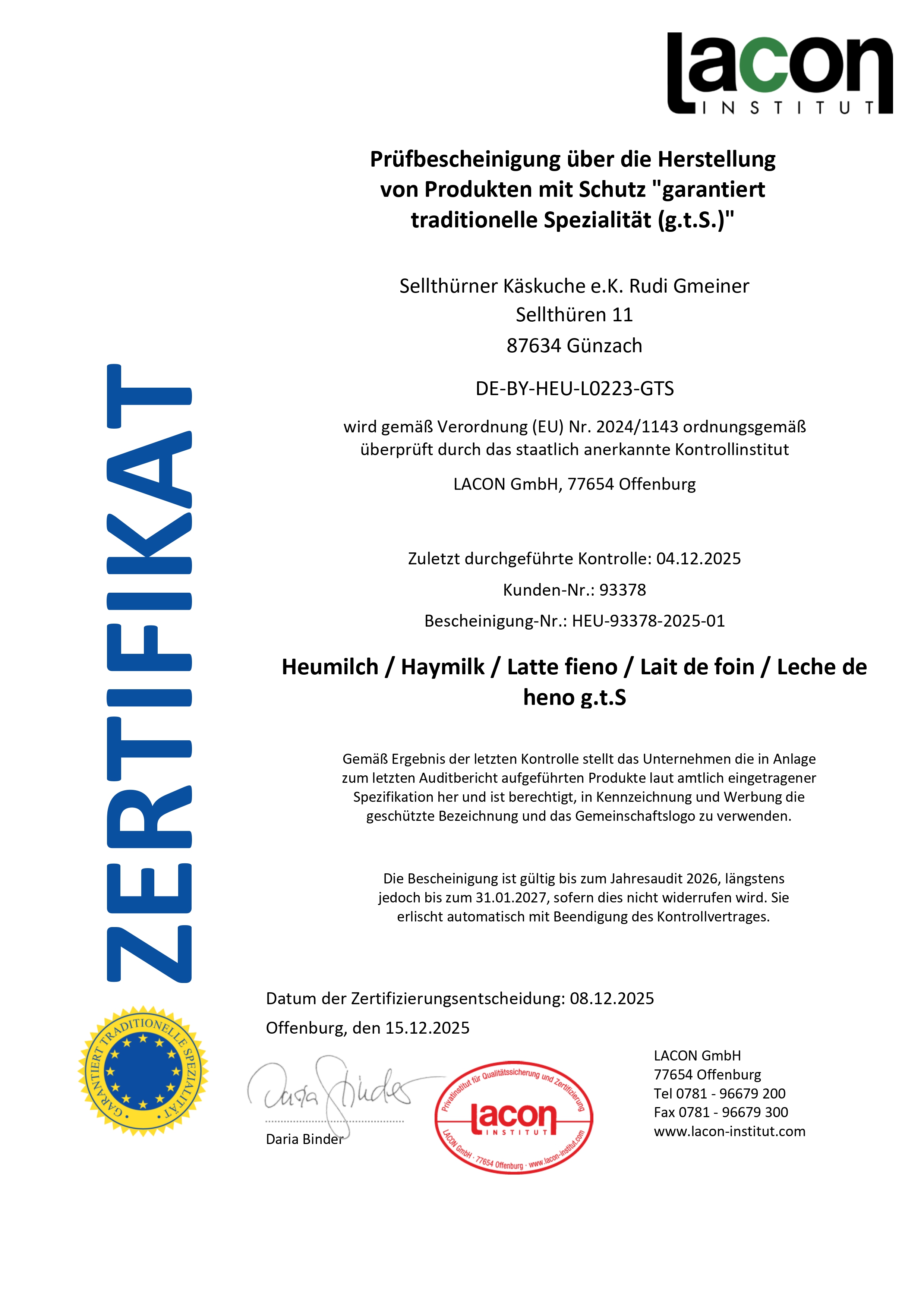 Heumilch g.t.S Zertifikat